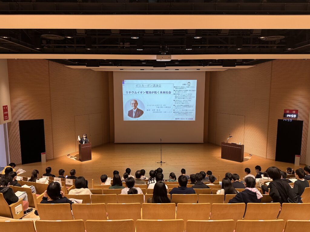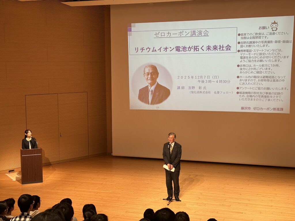 2025年12月7日(日) Fプレイスにて、リチウムイオン二次電池の発明者であり、ノーベル化学賞を2019年に受賞されました藤沢市在住の吉野 彰 氏を講師にお招きして、未来を担う若者たち(生徒・学生)に向けたメッセージとしてゼロカーボン講演会【リチウムイオン電池が拓く未来社会】が開催されました。