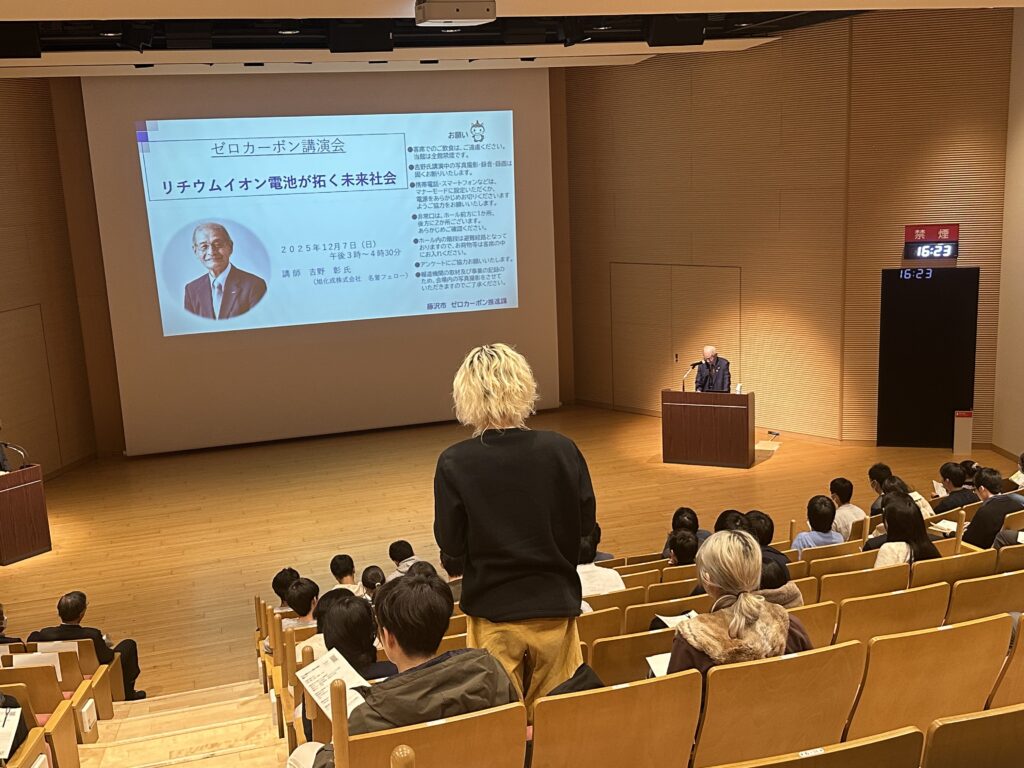2025年12月7日(日) Fプレイスにて、リチウムイオン二次電池の発明者であり、ノーベル化学賞を2019年に受賞されました藤沢市在住の吉野 彰 氏を講師にお招きして、未来を担う若者たち(生徒・学生)に向けたメッセージとしてゼロカーボン講演会【リチウムイオン電池が拓く未来社会】が開催されました。