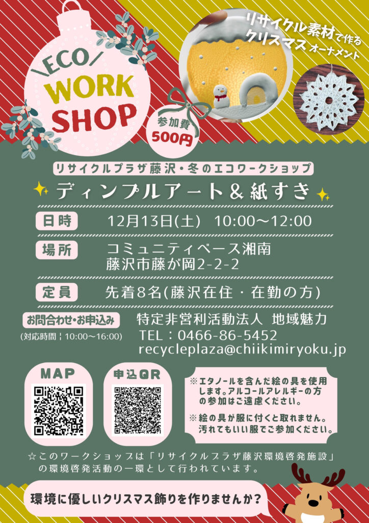 ディンプルアート&紙漉きの2本立てワークショップ! 今年のクリスマスは、キラキラなディンプルアートと紙漉きのオーナメントを飾りましょう! ▶ディンプルアートとは、自動車フロントガラスの製造過程で出る廃材(飛散防止用のPV […]