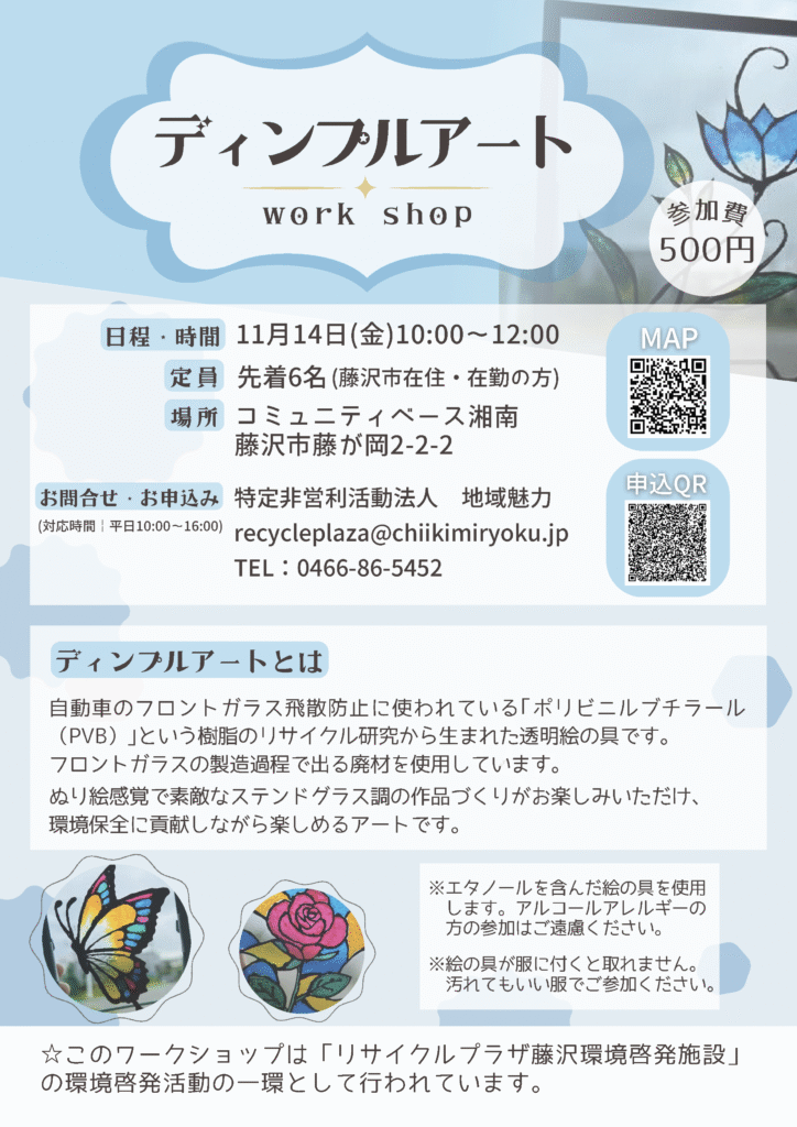 ディンプルアート・ワークショップ ディンプルアートとは自動車のフロントガラス飛散防止に使われている「ポリビニルブチラール(PVB)」という樹脂のリサイクル研究から生まれた透明絵の具です。フロントガラスの製造過程で出る廃材 […]